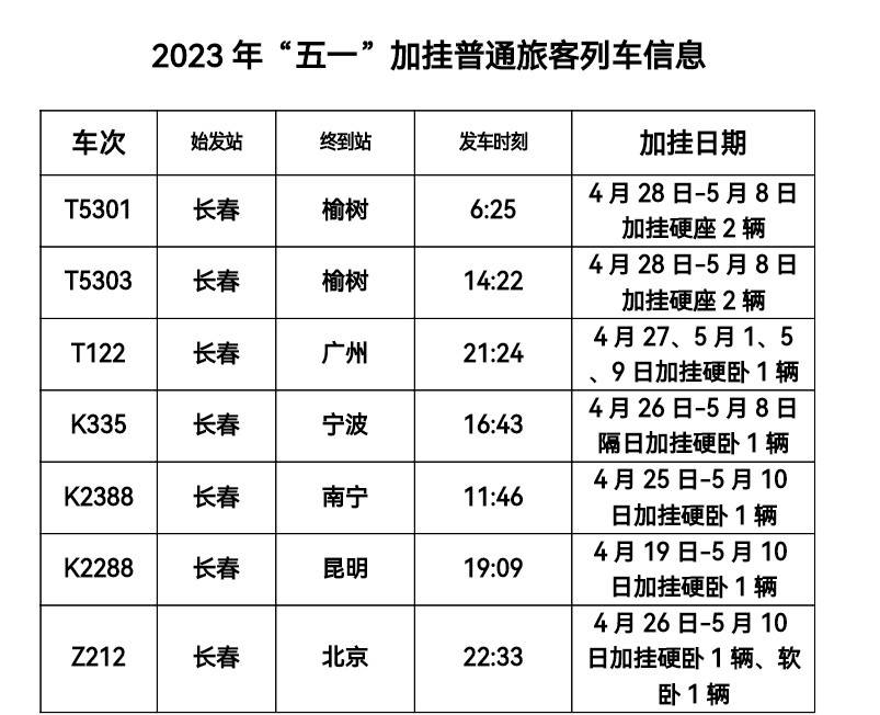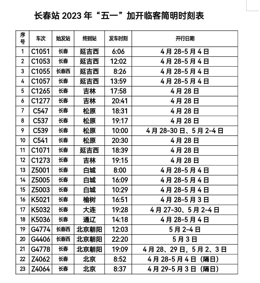 为充分满足旅客出行需求,长春站加开北京、延吉、吉林、松原、大连等方向临时旅客列车23列、动车组列车重联12列、普速旅客列车加挂7列,保障旅客顺利出行。
