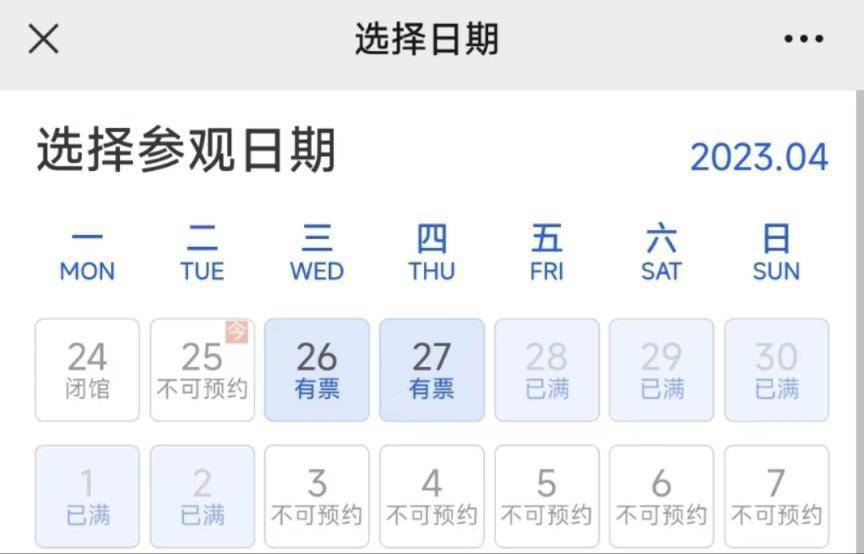 18时34分,经过多次尝试,记者进入小程序预约服务系统,发现5月2日的门票已约满,4月29日至5月1日每天只有1至2张余票。18时40分,再次进入预约系统,4月29日至5月2日均显示“已约满”。