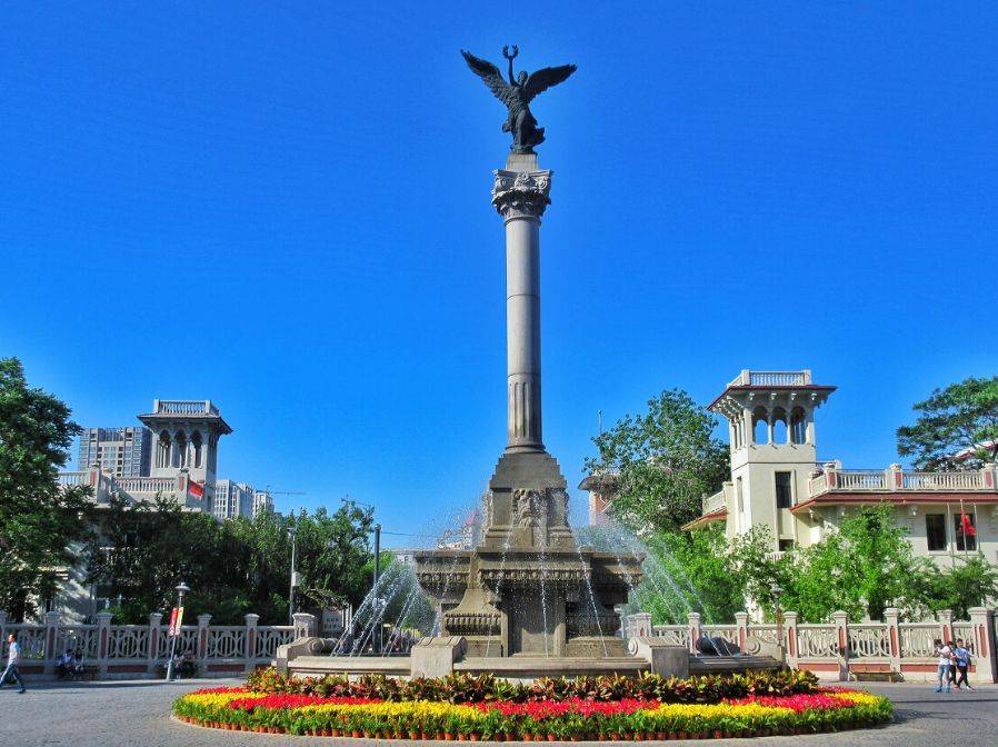 马可波罗广场占地2200平方米,和平女神雕塑位于广场中心,是为纪念第一次世界大战胜利而建,建成后由意大利途经上海运至天津。