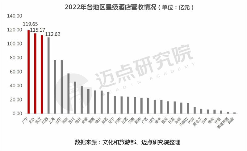 从各省市地区星级酒店营业收入情况分析,广东省以119.65亿元位列第一,占全国星级酒店营业收入总额的10.16%。其次是和北京市和浙江省,营业收入分别为115.17亿元、112.62亿元。江苏、上海、山东、福建、四川、河北、安徽位列前十,整体来看,前十个地区中经济发达的东部沿海省区(浙江、江苏、上海、山东、福建)占据一半。