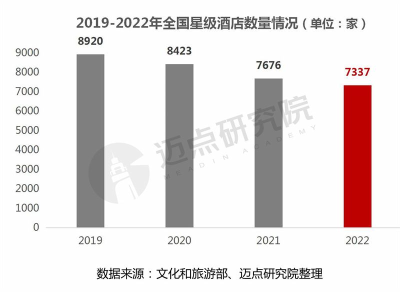 从星级酒店数量分析,2022年全国共经营星级酒店7337家,比上年减少339家,同比减少4.42%。同时,比较自2019年至2022年近4年的星级酒店数量的变化情况,从图可知:呈现逐年递减的趋势,4年间减少1583家星级酒店。 可见,疫情对酒店经营造成巨大冲击,近年来高星级酒店出售、拍卖现象不断频发即是最直观的证明。