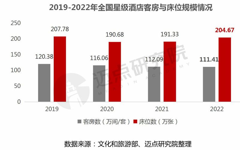 从星级酒店客房数和床位数规模角度看,2022年全国星级酒店拥有客房111.41万间/套,床位204.67万张。同2021年相比,客房数减少0.68万间/套;床位数增加13.34万张,同比增加6.97%。比较可发现一件“意外”现象:客房数量减少,而床位数却增加,表明单个酒店的床位供给扩大。这与2022年疫情期间,星级酒店“变身”隔离点有关,依据需求增加一定数量的床位。