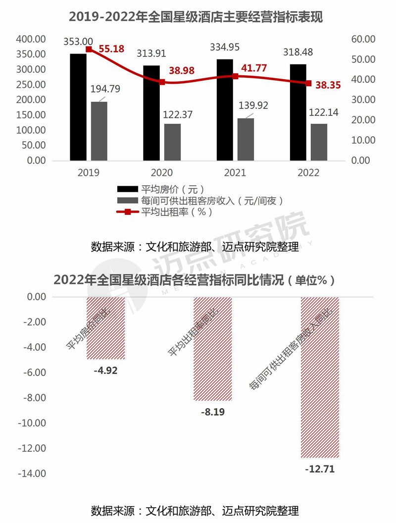 2022年全国星级酒店的平均房价、平均出租率、每间可供出租客房收入(Revpar)表现:整体来看,各指标同比均呈下降态势。其中,平均房价318.48元,同比下降4.92%;平均出租率38.35%,同比下降8.19%;Revpar 122.14元/间夜,同比下降12.71%。可见,2022年全国星级酒店整体经营情况表现不佳,各指标均有下滑。