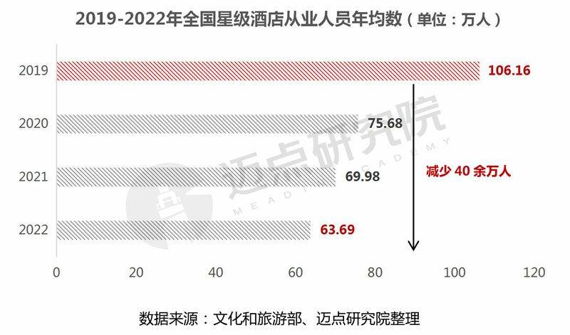从业人员年均数情况:酒店业属于劳动密集型产业,且服务特性决定了人员接触多,因而受“口罩”因素最为直接深刻。全国星级酒店从业人员自2019年至2022年四年间,减少额高达约42万人,从业人员数量骤降。一方面,酒店企业在无法营业、经营承压的情况下,裁员压缩成本;另一方面,员工出于安全、压力的因素考虑,行业发展信心受挫,主动离职。