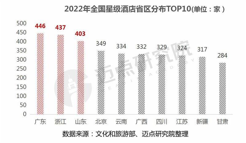 从各地星级酒店数量来看,广东、浙江、山东位列前三,分别有446家、437家、406家。北京、云南、广西、四川、江苏、新疆、甘肃位列前十,TOP10省市地区星级酒店拥有数量总计为3555家,占全国星级酒店总数的48.45%,占比接近一半。
