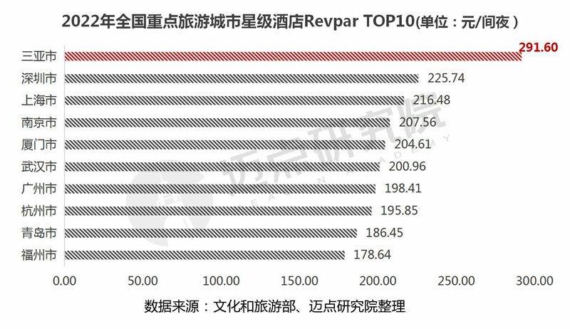 50个重点旅游城市星级酒店每间可供出租客房收入(Revpar)情况:50个城市中高于全国Revpar 122.14元/间夜)水平的共计28个,其中三亚市以291.60元/间夜领先其他城市,位列第一。值得一提的是,三亚市星级酒店Revpar连续三年稳居榜首(2020年为325.73元/间夜、2021年为388.05元/间夜),彰显了全国明星旅游城市的客流强大吸引力、星级酒店的优异经营水平。但是,对比三年数据,2022年虽名列首位,但却跌破300元/间夜,表明整体下滑趋势明显。