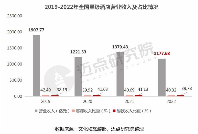 2022年全国星级酒店营业收入总额1177.68亿元(仅占2019年营业收入总额的61.73%),其中餐饮收入467.85亿元、占比39.73%,客房收入474.88亿元、占比40.32% ,客房收入比重稍高于餐饮收入比重(高0.59%)。同比2021年,营业收入总额减少约200亿元,同比下降14.63 %。受“口罩”因素的持续扰动影响,2022年酒店经营受限制,导致营收下降。
