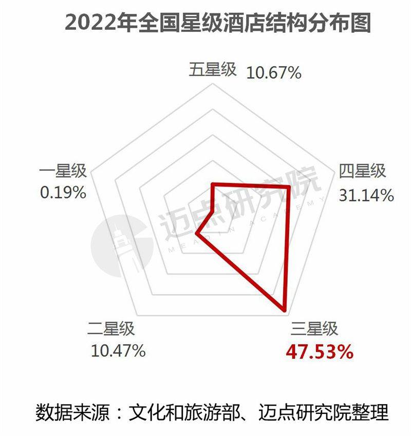 从星级酒店组成结构分析,7337家星级酒店中五星级酒店783家、四星级酒店2285家、三星级酒店3487家、二星级酒店768家、一星级酒店14家。从中可以得知:三星级酒店(一般对应经济型酒店)数量最多,占比47.53%,位列各星级榜首;其次是四星级酒店,占比31.14%。三星级和四星级合计占比78.67%,中端及中高端酒店构成星级酒店市场的基石。