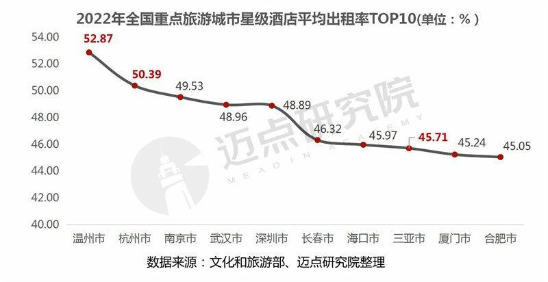 50个重点旅游城市平均出租率情况:50个城市中平均出租率高于全国平均水平(38.35%)的城市共有32个,占比64%。同属于浙江省的温州、杭州两个城市分别位列第一、第二,星级酒店平均出租率分别为52.87%、50.39%,均高于50%,表明2022年这两个城市星级酒店住宿客源情况相对较优。此外,相比2021年,2022年三亚市星级酒店平均出租率下滑较严重(2021年三亚市星级酒店出租率54.98%,全国第一),下降7个名次,位列第八。究其原因,主要是2022年三亚受“口罩”影响,区域封控管制,酒店无法正常经营、入住客人少等。
