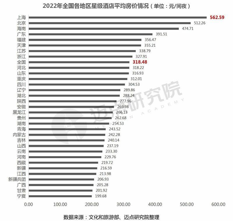 各地区星级酒店平均房价情况:32个地区中高于全国星级酒店平均房价(318.48元/间夜)的地区仅有8个,从高到低依次为上海、北京、海南、广东、福建、天津、江苏、浙江,其中上海市星级酒店平均房价562.59元/间夜,以绝对领先优势位列全国第一。广西、甘肃、宁夏等西部地区星级酒店平均房价排在全国末尾,具有较大的提升空间。