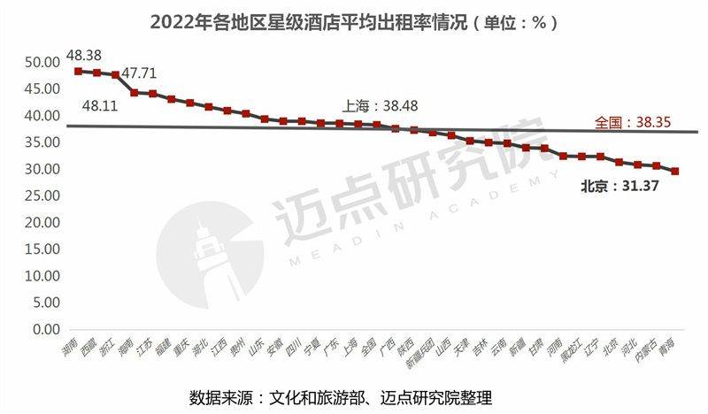 各地区星级酒店平均出租率情况:32个地区中高于全国星级酒店平均出租率(38.35%)水平的地区共有16个,占据一半。其中,湖南、西藏两个地区平均出租率高于48%,领跑全国;浙江省以47.71%位列第三。值得留意的是,2022年,上海、北京这两个城市星级酒店平均出租率——38.48%、31.37%,前者仅略高于全国水平、后者低于全国约7个百分点,主要因为上海、北京2022年期间受到“口罩”因素的多轮扰动,严重影响酒店的正常经营,直接造成酒店出租率水平大幅下滑(备注说明:2021年上海星级酒店平均出租率50.75%,位列全国第一;北京市星级酒店平均出租率41.24% )。