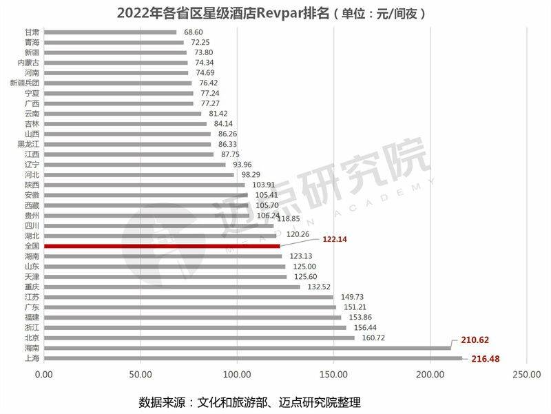 各省市地区星级酒店每间可供出租客房收入(Revpar)情况:2022年上海、海南两个地区星级酒店Revpar(216.48元/间夜、210.62元/间夜)以高于200元/间夜的水平引领全国,表明这两个地区星级酒店的经营水平较高。其余,高于全国水平(122.14元/间夜)的地区还有北京、浙江、福建、广东、江苏、重庆、天津、山东、湖南9个地区。