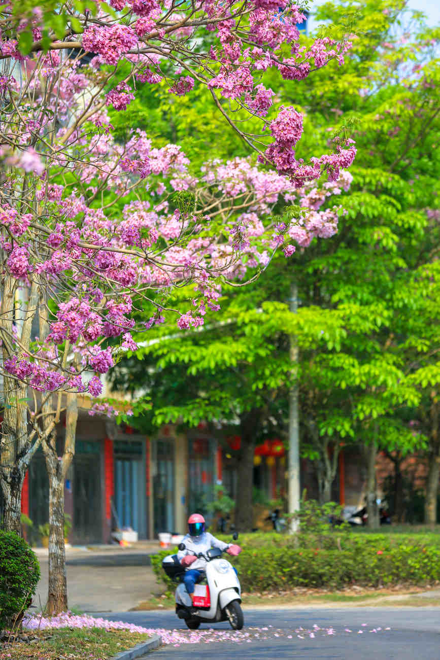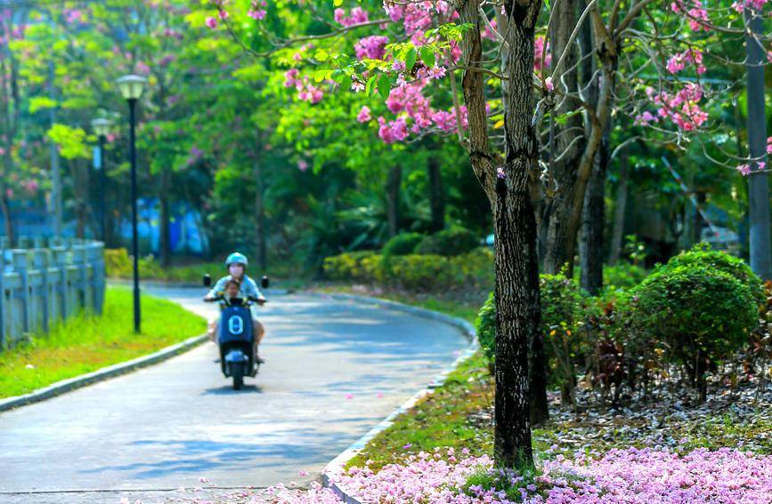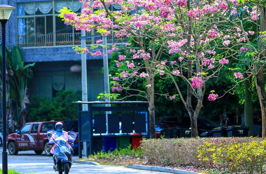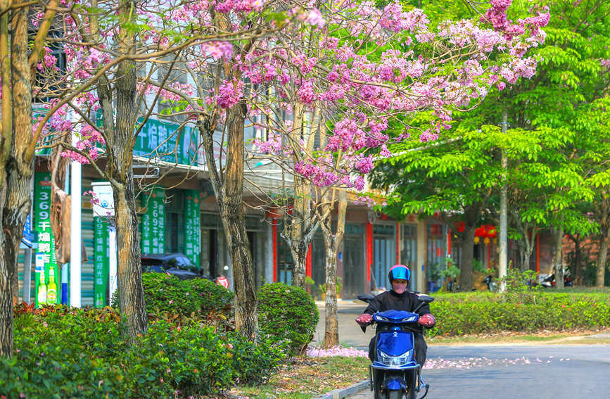 人民网儋州4月26日电 (陈海燕)谷雨时节,艳阳高照,百花盛开!近日,在海南省儋州市城区内多条主干道、大小公园、居民小区里,一簇簇、一朵朵的蔷薇钟花悄然绽放,千枝万朵,艳丽娇媚,放眼望去犹如粉色海洋,当风起时,朵朵粉色轻轻摇曳,花瓣散落一地,像一张张粉色地毯,成为一道道亮丽的风景线。