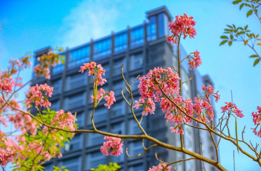 城区内多条主干道的蔷薇钟花悄然绽放。羊文彪摄