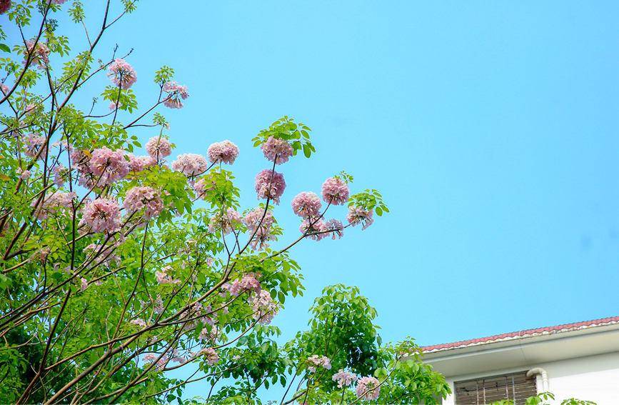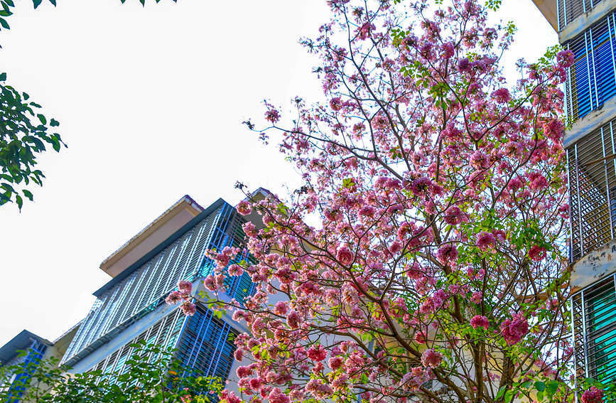 蔷薇钟花,别名洋红钟花、玟红钟花、洋红风铃木、紫绣球,紫葳科落叶大乔木,是世界热带著名的花树。它尤其喜欢阳光、高温,作为观赏植物的特色树种,大叶紫薇在儋州市那大建成区内被广泛种植,花期为4-5个月。