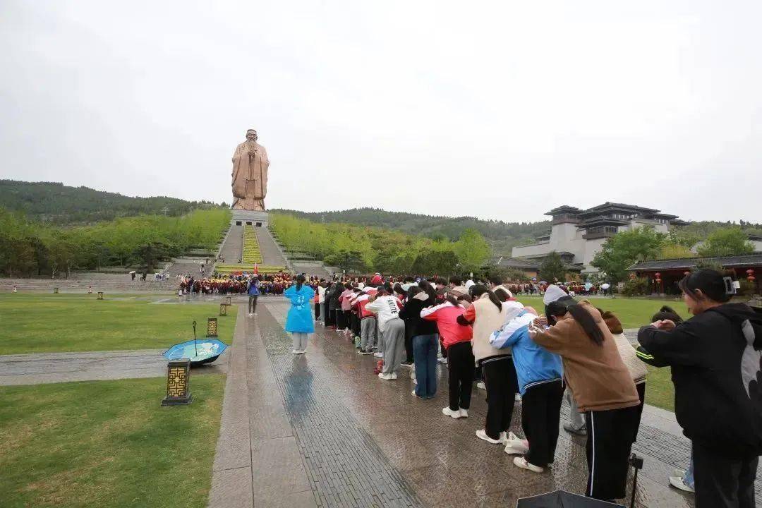 贴号牌、进行互动游戏,三辆大巴车载着一百多人驰骋在开往曲阜的路上。一个半小时的车程在大家欢乐的气氛中很快过去。进入景区之后,在导游的带领下一百多名学员们,首先来到了尼山圣境景区,开启尼山圣境研学之行。金声玉振广场大家瞻仰了72米高的孔子像。远远望去,近百米高的孔子立像让人心生敬畏。