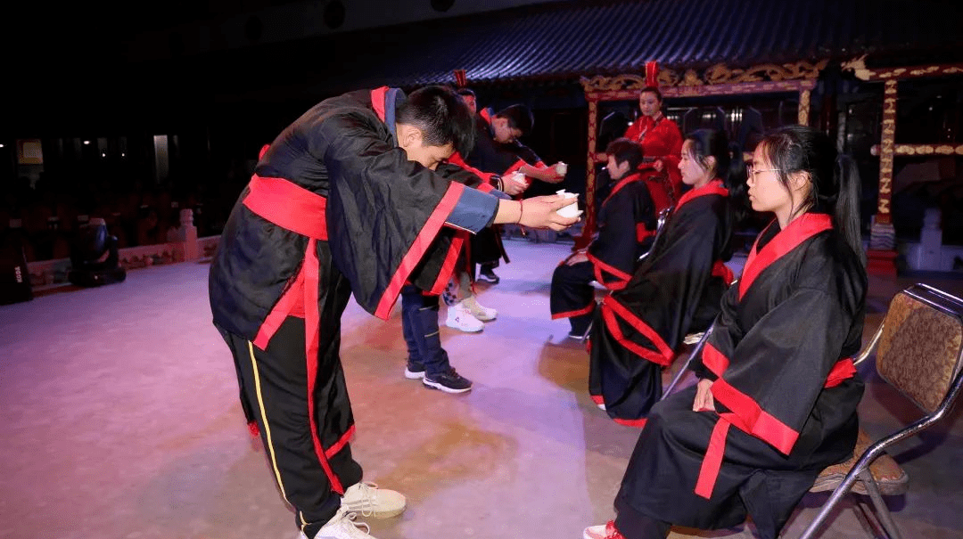 集体用餐后,大家来到孔子六艺城。带着新鲜、好奇和兴奋的心情,学员们第一次穿上了汉服,“拜师礼”也随即开始。拜师礼,又称束脩礼,是古代学子与师长初次见面时的一种礼节。仪式上学员们着汉服行拜师礼。在主持人引导下正衣冠、诵读誓词立志发奋读书、表达对伟大圣贤的敬仰之情。本次拜师礼的仪程严格按照古代拜师礼的程序,通过拜师礼,学员们更加懂得了尊师明礼,也让大家更直观地接触儒家思想精髓,体会传统文化的震撼力。接下来,学员们乘坐御车,跨越时空,踏上孔子当年周游列国的艰难历程,追思先哲探寻真理的艰辛,感悟“天下为公”圣道之伟大。
