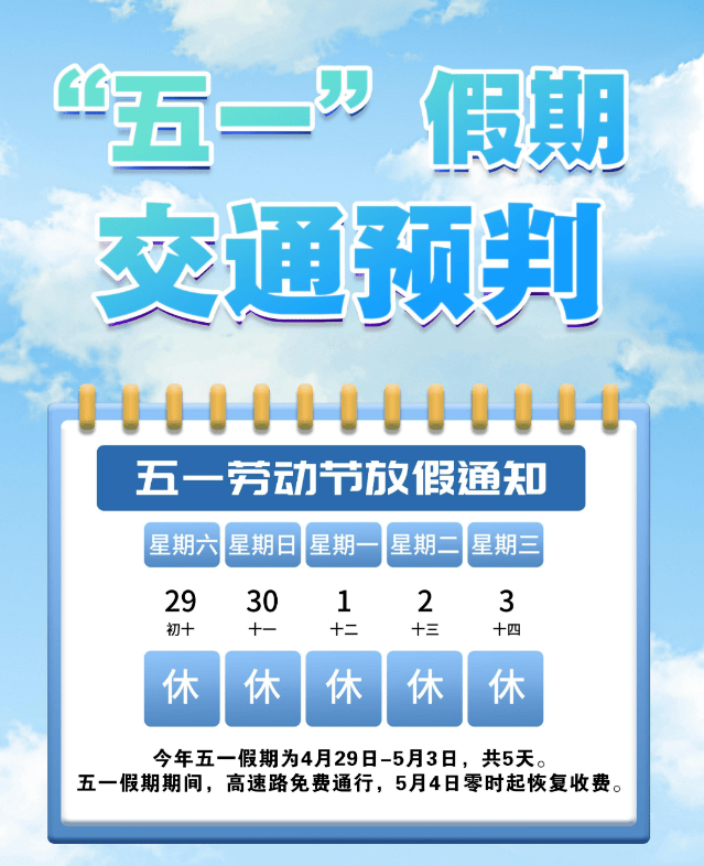 今年“五一”小长假从4月29日至5月3日,高速公路将继续实行七座以下客车免费通行政策。 具体免费时间:4月29日0点—5月3日24点。