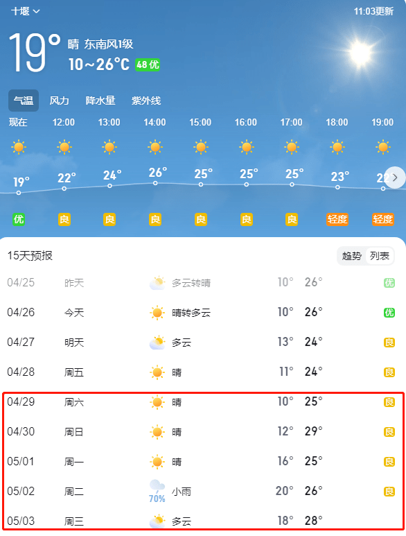 4月29日为小长假第一天, 8:00—11:00为出行高峰,预计 十堰东高速出城方向、武当山高速收费站处易拥堵。 5月3日为小长假最后一天, 16:00—21:00为返程高峰,预计 十堰高速东进城方向易拥堵。