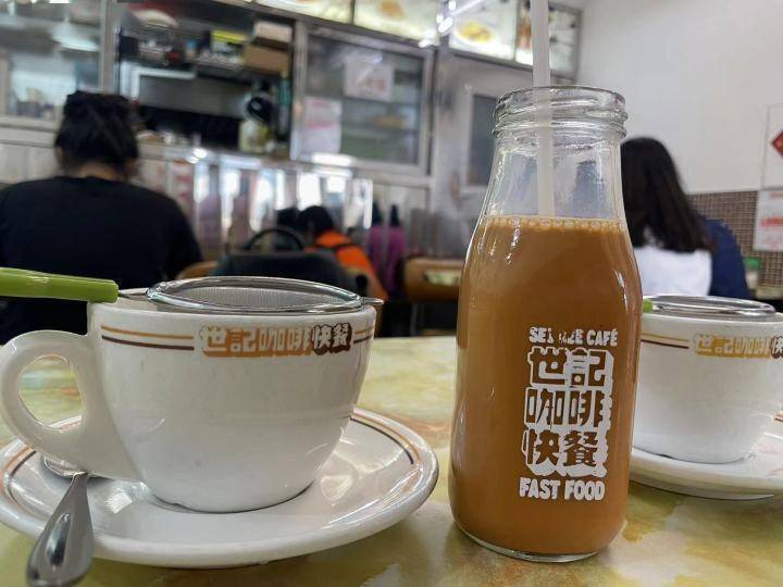 店里的招牌,炭烧瓦煲咖啡,热饮是当场用瓦煲制作的,味道确实有股浓浓的炭烧味,咖啡味很浓郁,就是很地道的港式咖啡;冷饮是制作好放在冷柜里的,里面加了奶和糖,口感偏甜,但是可以接受的、不腻的甜。猪扒包一定要趁热吃,肉是超级厚实的那种,煎的很嫩,可以加鸡蛋,味道也是一绝。这家店连续多年被评为米其林餐厅,也是很多网友推荐必打卡美食地。