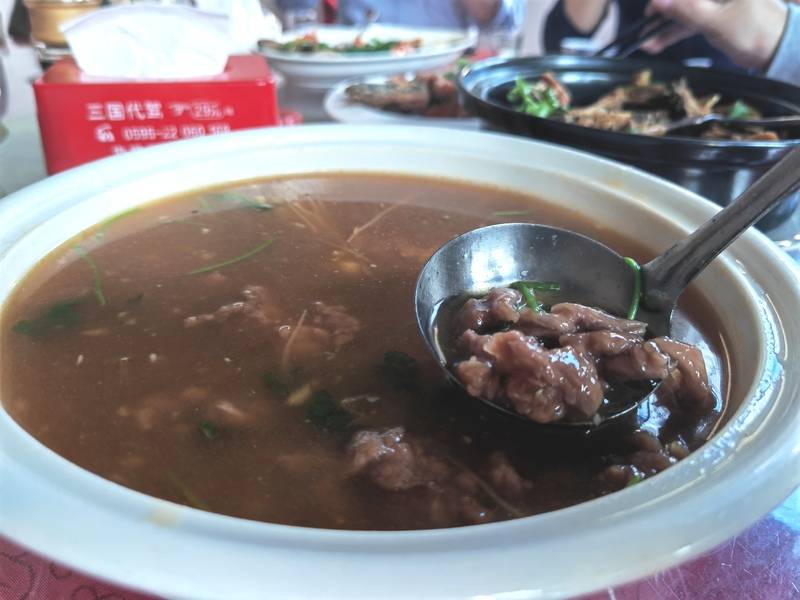 抵达泉州的第二晚,记者前往一处小店购买泉州特产绿豆饼未果,乘上一辆“小白”准备回酒店。听到记者和另几名游客向司机报出的目的地酒店在古城区,车上一名热情的泉州人自告奋勇向大家推荐起附近可以买正宗绿豆饼的地方,并告诉我们哪里有好吃的小店:“你们酒店对面的东兴牛肉馆就很好吃,东是‘东方’的‘方’,兴是‘兴旺’的‘旺’……”意识到接连说错两个字,这位热心的泉州男士一边笑,一边继续推荐早餐可以去附近小店吃面线糊,并一再叮嘱:“来泉州一定要吃最有特色的东西,酒店的早餐不要吃了,各家都差不多!”
