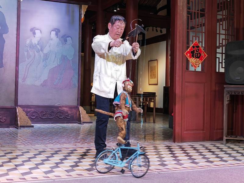 天色将晚时步入红砖古厝的非遗体验馆,在院内落座,游客们可以在这里欣赏到泉州多项非物质文化遗产:古老而又独特的民间群舞拍胸舞、火鼎公婆舞同台亮相,极具闽南特色;素有“中国音乐史上的活化石”之称的南音清柔曼丽、余音绕梁;由国际木偶大师、泉州提线木偶省级传承人林文荣带来的木偶戏表演《驯猴》妙趣横生……游客一边品着小吃茶点,一边欣赏精彩的表演。每段表演完成后,演员还会讲述其中的文化内涵和动作要点,并邀请游客上台一试身手。