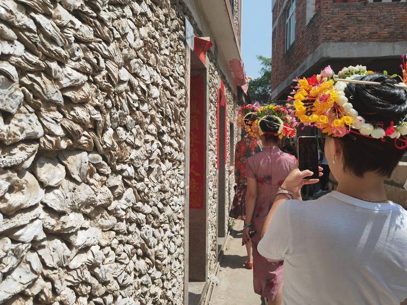 梳着簪花围的游客行走在蟳埔渔村蚝壳厝旁