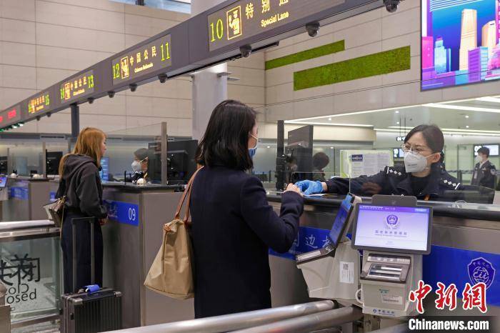 虹桥边检站民警在对出境旅客进行信息核查。 殷立勤 摄