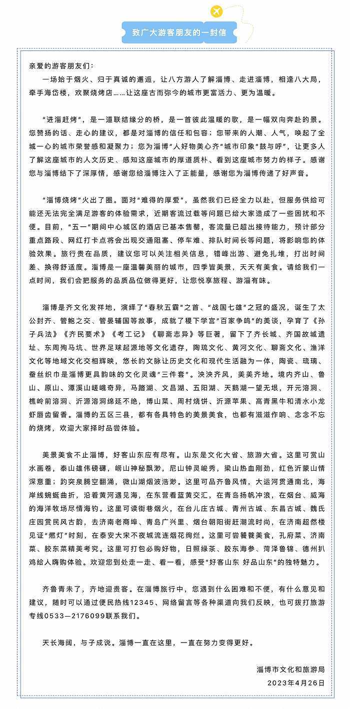 4月26日,淄博市文化和旅游局发布《致广大游客朋友的一封信》。信中提到:“淄博烧烤”火出了圈。面对“难得的厚爱”,虽然我们已经全力以赴,但服务供给可能还无法完全满足游客的体验需求,近期客流过载等问题已给大家造成了一些困扰和不便。目前,“五一”期间中心城区的酒店已基本售罄,客流量已超出接待能力,预计部分重点路段、网红打卡点将会出现交通阻塞、停车难、排队时间长等问题,将影响您的体验效果。旅行贵在品质,建议您可以关注相关信息,错峰出游、避免扎堆,打出时间差、换得舒适度。请给我们一点时间,我们会把服务的品质品位做得更好,让您悦享旅程、游淄有味。