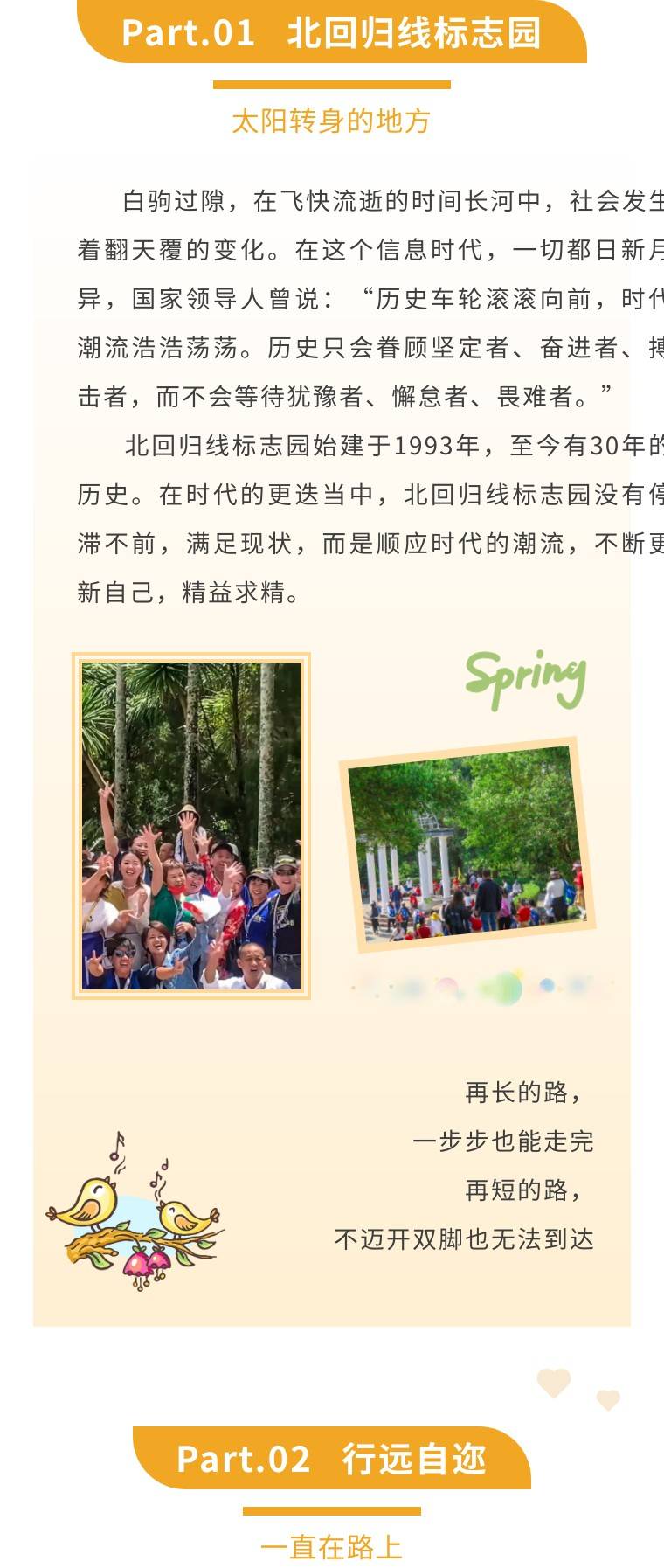 北回归线标志园在日常管理工作中,以“抓管理、促服务、树形象、创佳绩”的总体经营思路,妥善解决各种遇到的问题,做到让顾客满意。景区的业务接待能力不断增强,最高日接待能力可达上万人。此外,景区还接待各种类型的游客,旅游团、散客、研学团、房车旅行等等,景区综合能力在不断提升。同时,我们也在不断调整优化公园的设施设备、服务项目。