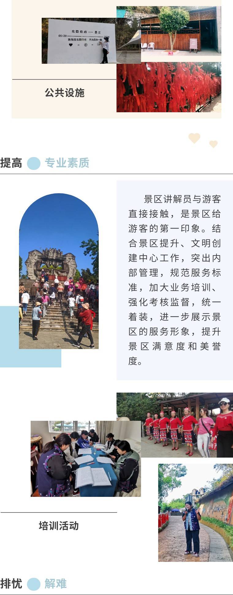 时刻为游客排忧解难,及时解决客人在景区游览过程中遇到的问题。为避免游客在排队过程中,产生乏味、焦虑等负面情绪,景区安排舞蹈队在广场中央表演民族舞,吸引游客注意,缓解游客情绪。 游客遇到意外情况,工作人员为其提供力所能及的帮助。