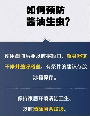 怎么样做才可以预防酱油生虫呢?其实很简单。第一,使用完酱油后将一定要将瓶盖拧紧,用干净的布或者纸巾将瓶口擦拭干净。第二、有条件的话可以放在冰箱储存哦!温馨提示,除了海天酱油等调味,家里的其他酱料也有可能会吸引酱亚麻蝇的光临哦!最后一定要保证厨房环境卫生,,当天的厨余垃圾要及时处理!