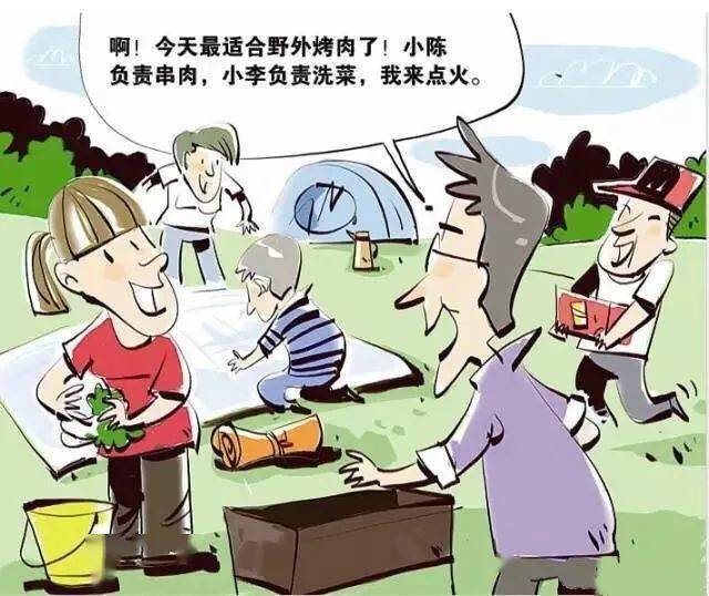 在野外烧烤,选择烧烤场地时要特别注意防火,周围不要有灌木或过多的树木,下风口周围不要有易燃物品。应选择无风天气和空旷的地点,在河边或者全是沙土的河滩地,既方便取水,又可以防备火灾发生时及时取水灭火。烧烤结束后,要及时用水或踩踏方式将火彻底熄灭,不要留半点火星,防止其引燃。