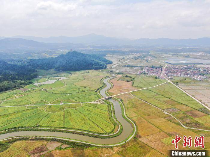 航拍浮梁县的广袤田园,连片农田与村落、青山、河流共同构成了一幅秀美画卷。 刘力鑫 摄