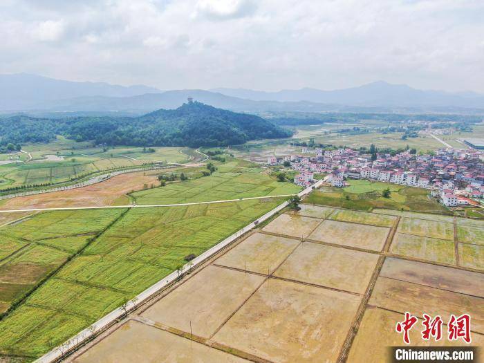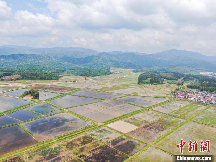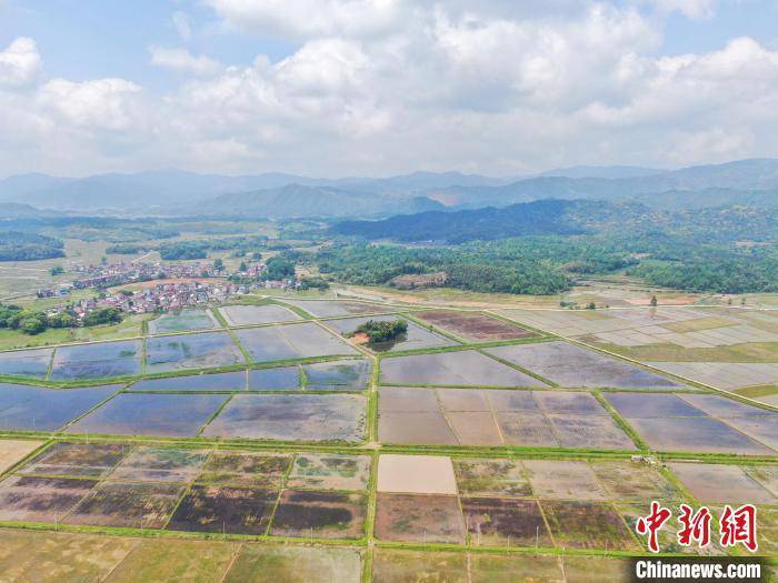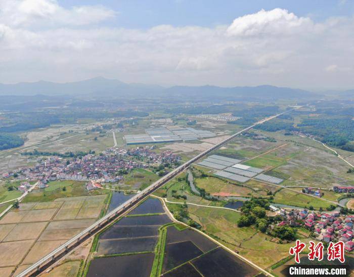 4月26日,航拍江西景德镇浮梁县的广袤田园,蓝天白云之下,一块块农田在阳光照射下熠熠生辉,与周围的村落、青山、小河、村道以及正在建设中的昌景黄高铁,共同构成了一幅秀美乡村画卷。