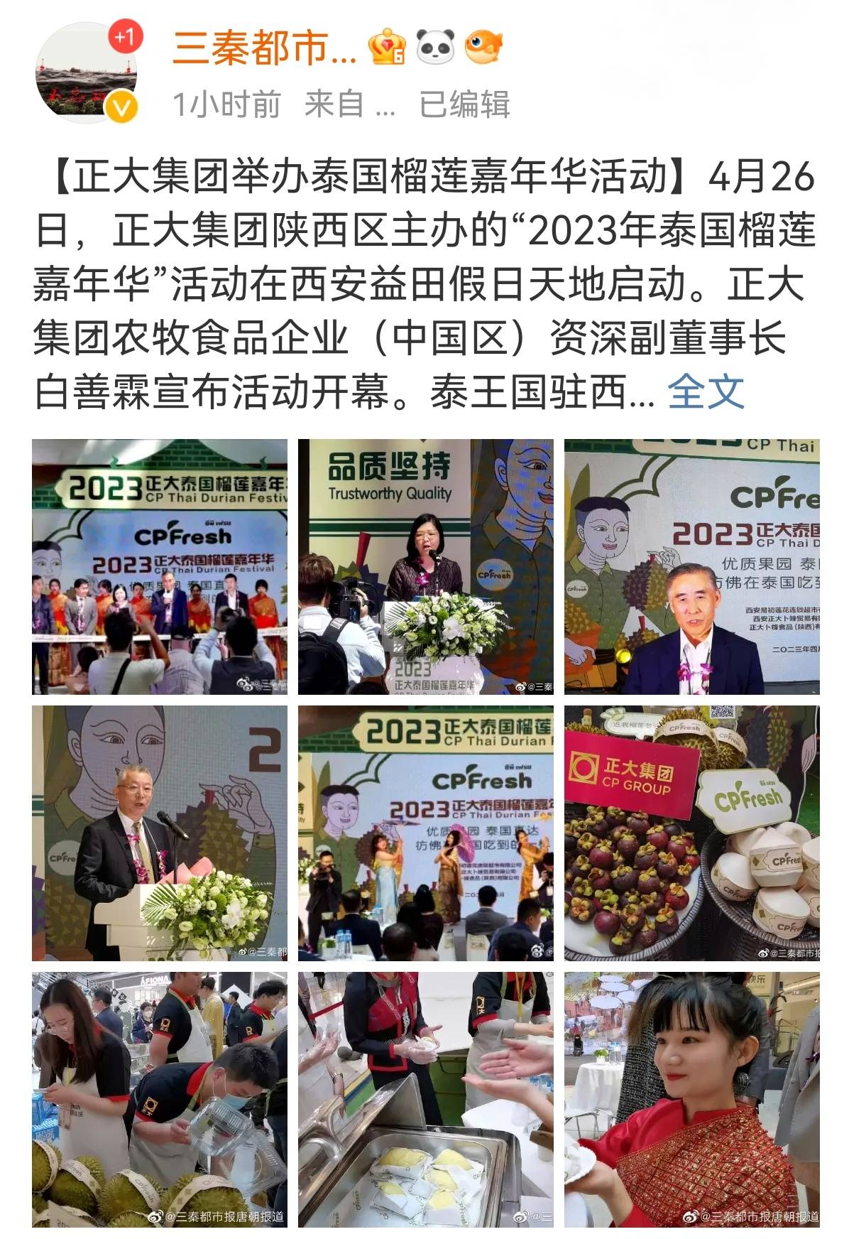 4月26日,正大集团陕西区主办的“2023年泰国榴莲嘉年华”活动在西安益田假日天地启动。正大集团农牧食品企业(中国区)资深副董事长白善霖宣布活动开幕。泰王国驻西安领事馆代总领事汪丽娜出席开幕式并致辞。