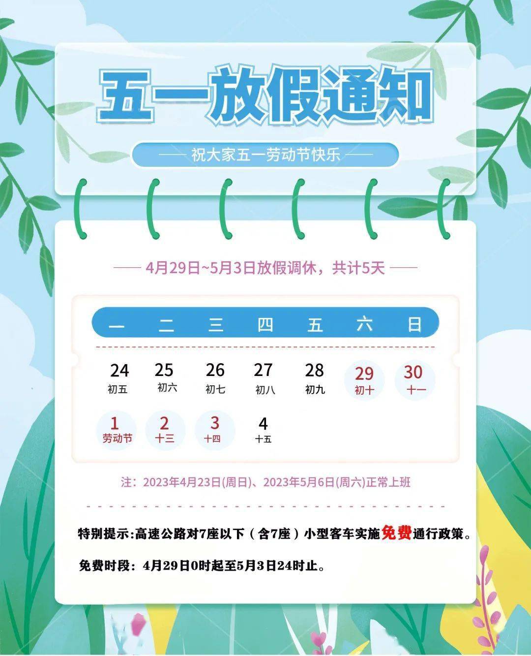 五一假期五天,高速公路对7座以下(含7座)小型客车实施免费通行政策, 免费时段从2023年4月29日0时起至5月3日24时止,以驶离出口收费车道的时间为准。