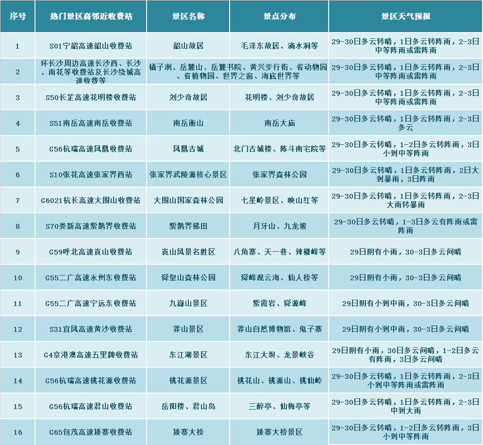 高速公路周边主要景区预览表