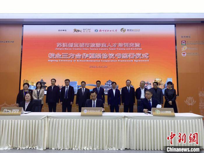 4月26日,澳门美高梅、扬州扬子江集团和扬州市职业大学签订校企合作框架协议。 崔佳明 摄