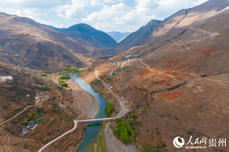 航拍牛栏江与威宁县海拉镇海元村(右)