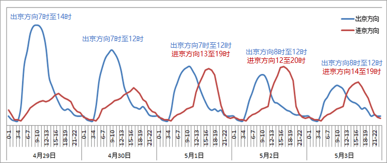 五一假期期间高速公路免收小客车通行费用,预计假期期间各条高速公路进、出京双方向车流量大,同时将出现上午出京、下午进京的潮汐车流高峰,京藏高速、京承高速、京港澳高速等将出现车辆集中和排队的情况。假期前半段上午的出京方向和假期后半段下午的进京方向,高速公路车流最为集中。