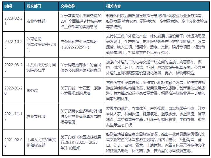 近些年,为鼓励露营旅游行业高质量发展,我国各部门纷纷出台了一系列政策,如2023年农业农村部发布的《关于落实党中央国务院2023年全面推进乡村振兴重点工作部署的实施意见》,制定休闲农业高质量发展指导意见和休闲农业行业服务指南。鼓励发展 教育农园、研学基地、 乡村露营游、乡土文化体验游等新模式。