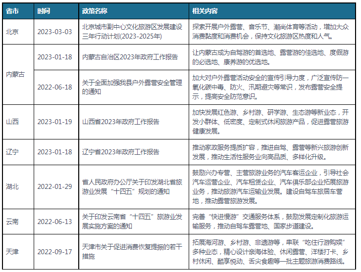 与此同时,各省市陆续发布了一系列政策促进露营旅游健康发展,如北京发布《北京城市副中心文化旅游区发展建设三年行动计划(2023-2025年)》提到,探索开展户外露营、音乐节、潮尚体育等活动,增加大众消费黏度和消费机会,保持文化旅游区热度和人气。