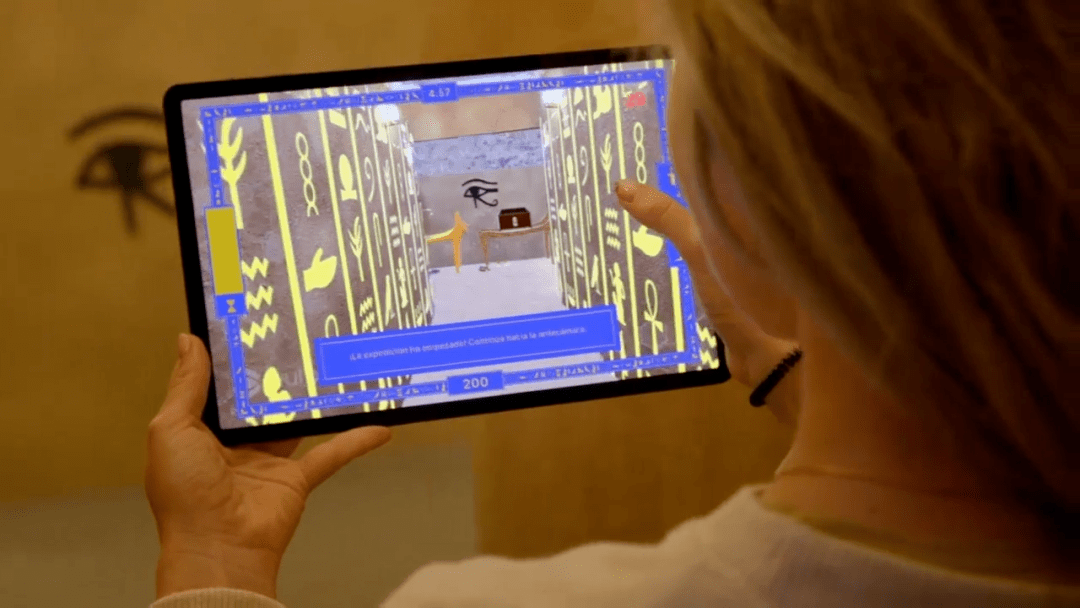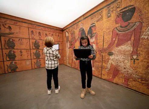 增强现实(AR)展区实现了让游客在自主游览过程中,通过互动来达成展出效果的独特形式,游客可以与图坦卡蒙的陵墓互动并探索它。借助外部设备,原本空无一物的墙壁上显现出了许多奇异的符号和壁画。