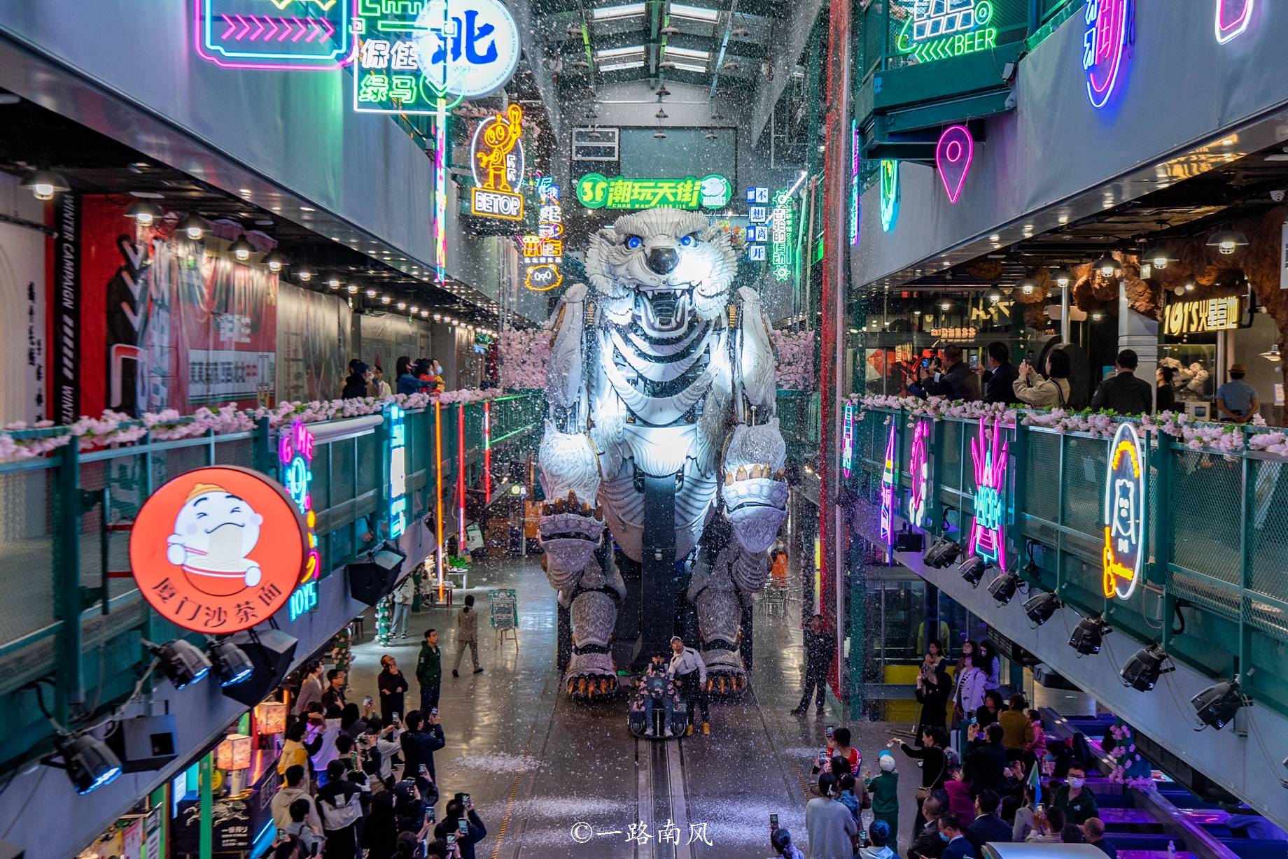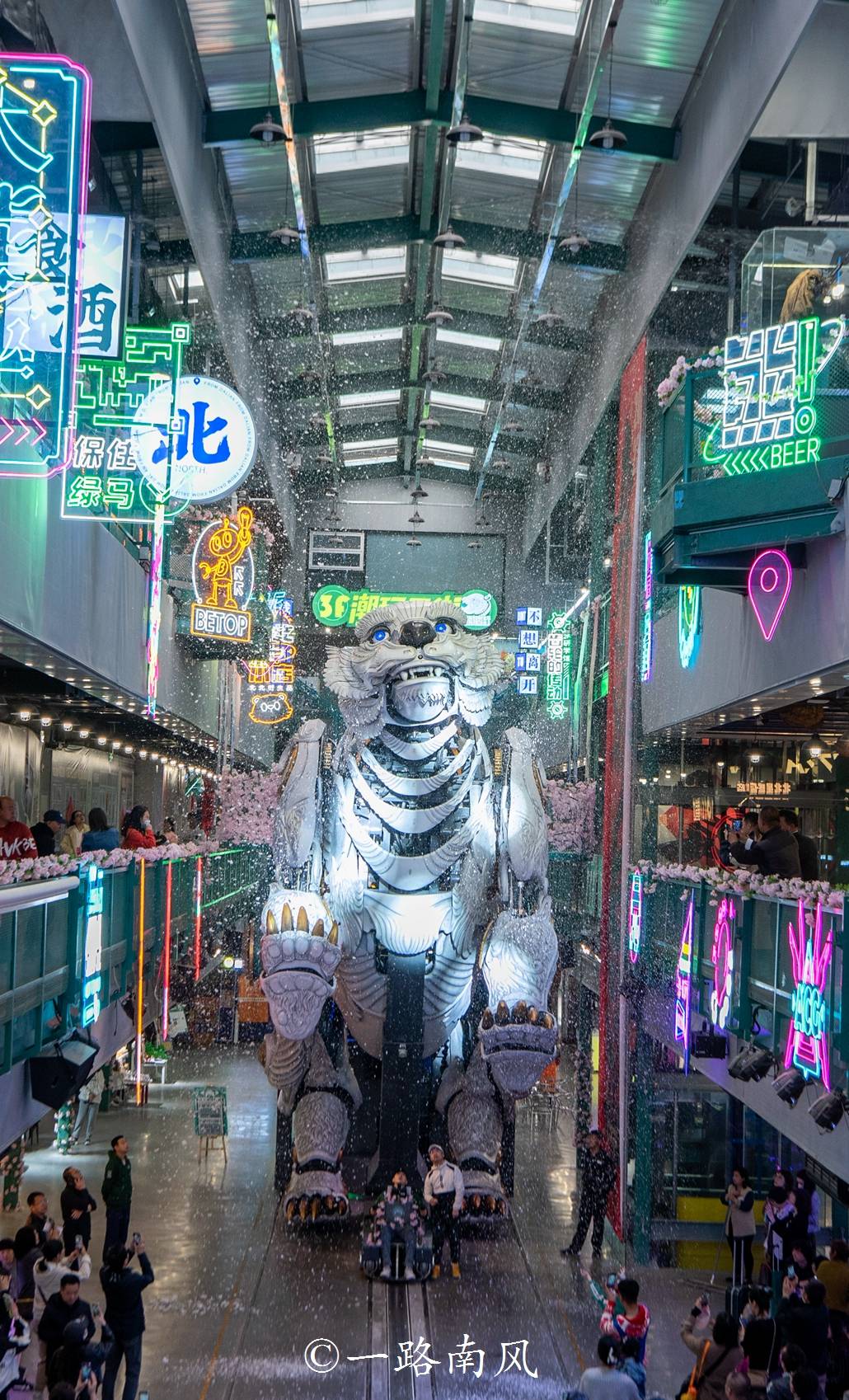 这个原创机械“巨物”高6米,重25吨,每天10点、12点、14点、16点和18点共有5场演出,表演期间动作灵活,一声巨吼瞬间吸引众人的注意力,沉浸式体验感满分。