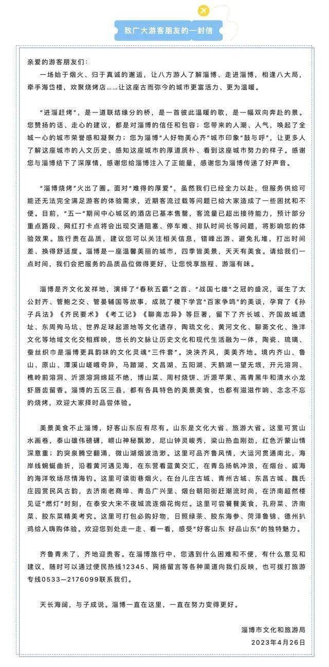 4月26日,淄博市文化和旅游局发布《致广大游客朋友的一封信》。