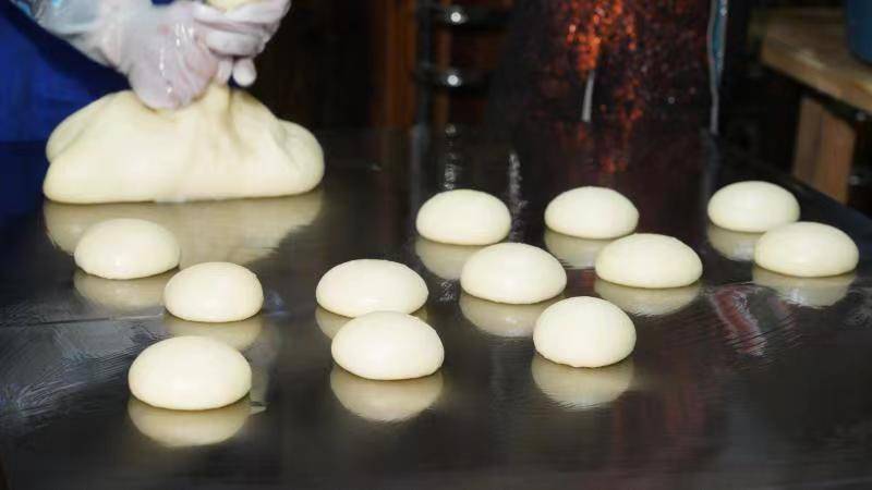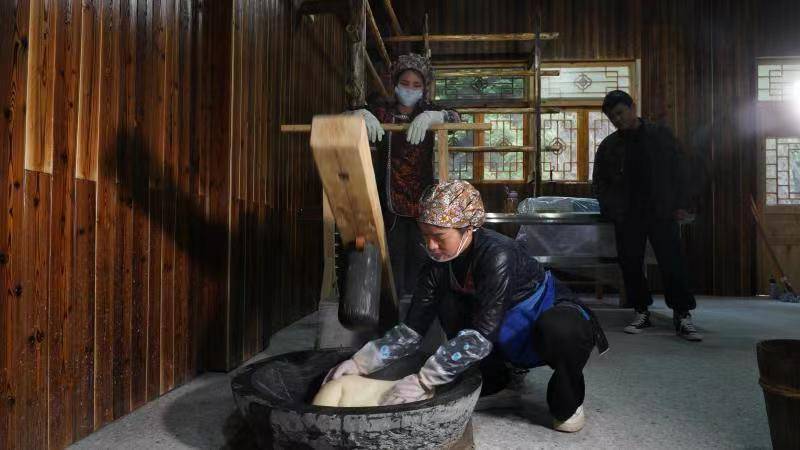 4月24日,记者在占里景区生态农特产品小作坊看到工作人员把刚蒸熟的香禾糯倒在石碓里忙着打糍粑。趁热捏成一个个黏性与弹性恰到好处的米团子。