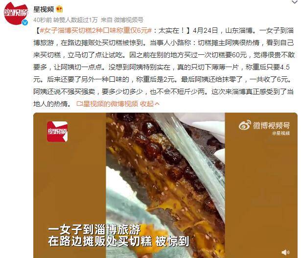 星视频的分享显示,4月24日,一女子到淄博旅游,在路边摊贩处买切糕被惊到。当事人小路称:切糕摊主阿姨很热情,看到自己来买切糕,立马切了点让试吃。