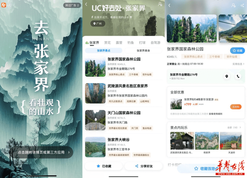 (UC好去处在五一前夕上线“去张家界看最壮观的山水”专题活动,为用户提供便捷的张家界出行信息服务。)