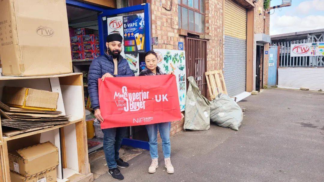 让人眼前一亮的是,这里批发产品多是中国电子烟产品,而且还可以看到一些中国头部电子烟品牌的批发商店广告牌,比如HQD、SMOK、易佳特aspire、优维尔UWELL、新宜康INNOKIN之类的品牌。甚至还看到开着奔驰来批发市场拿货电子烟的英国商人。